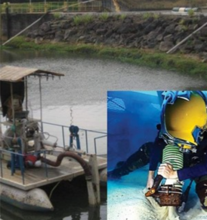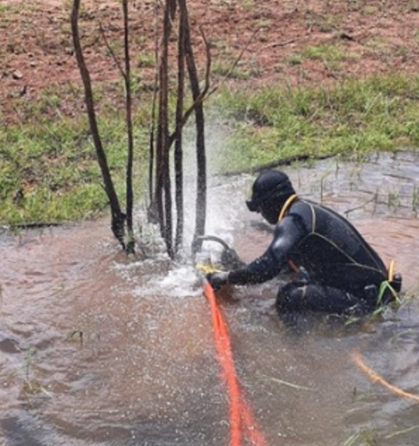 Limpeza de reservatórios, rios e lagos.O corte é feito em material lenhoso submerso e semi submerso, com uma serra especial e unidade hidráulica.